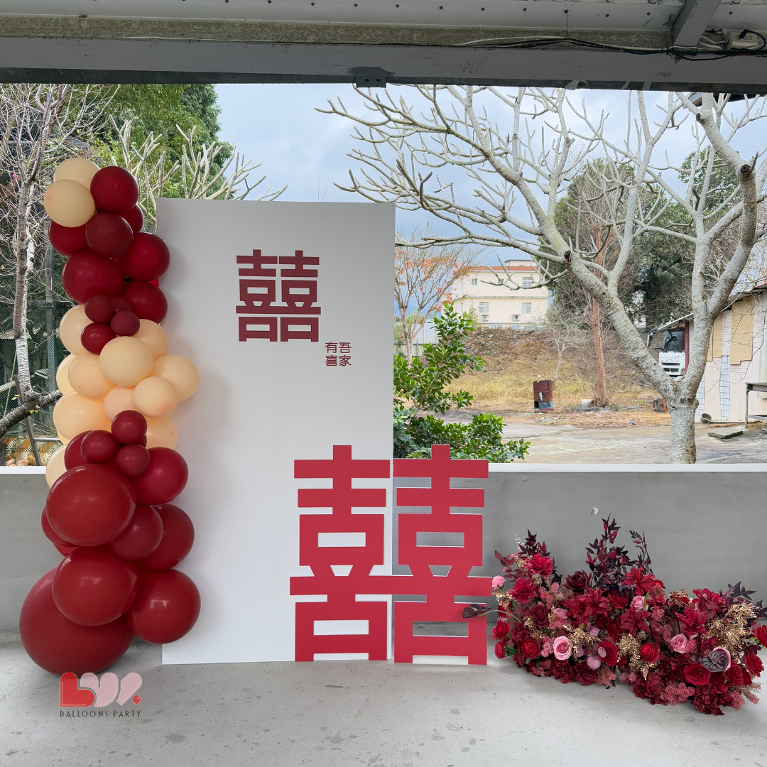 大面雙囍主背板搭配層次圓弧氣球與深紅花藝,
