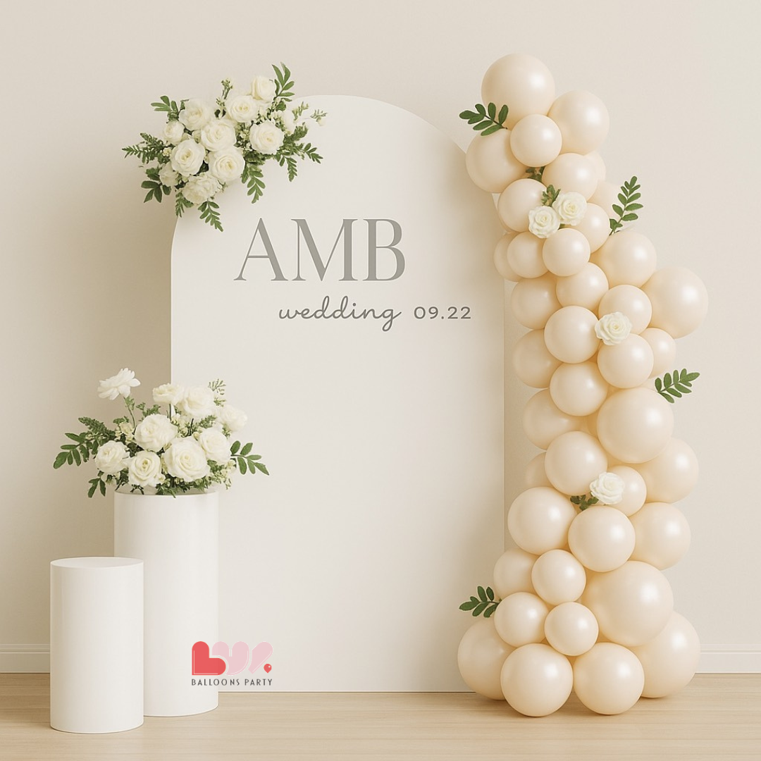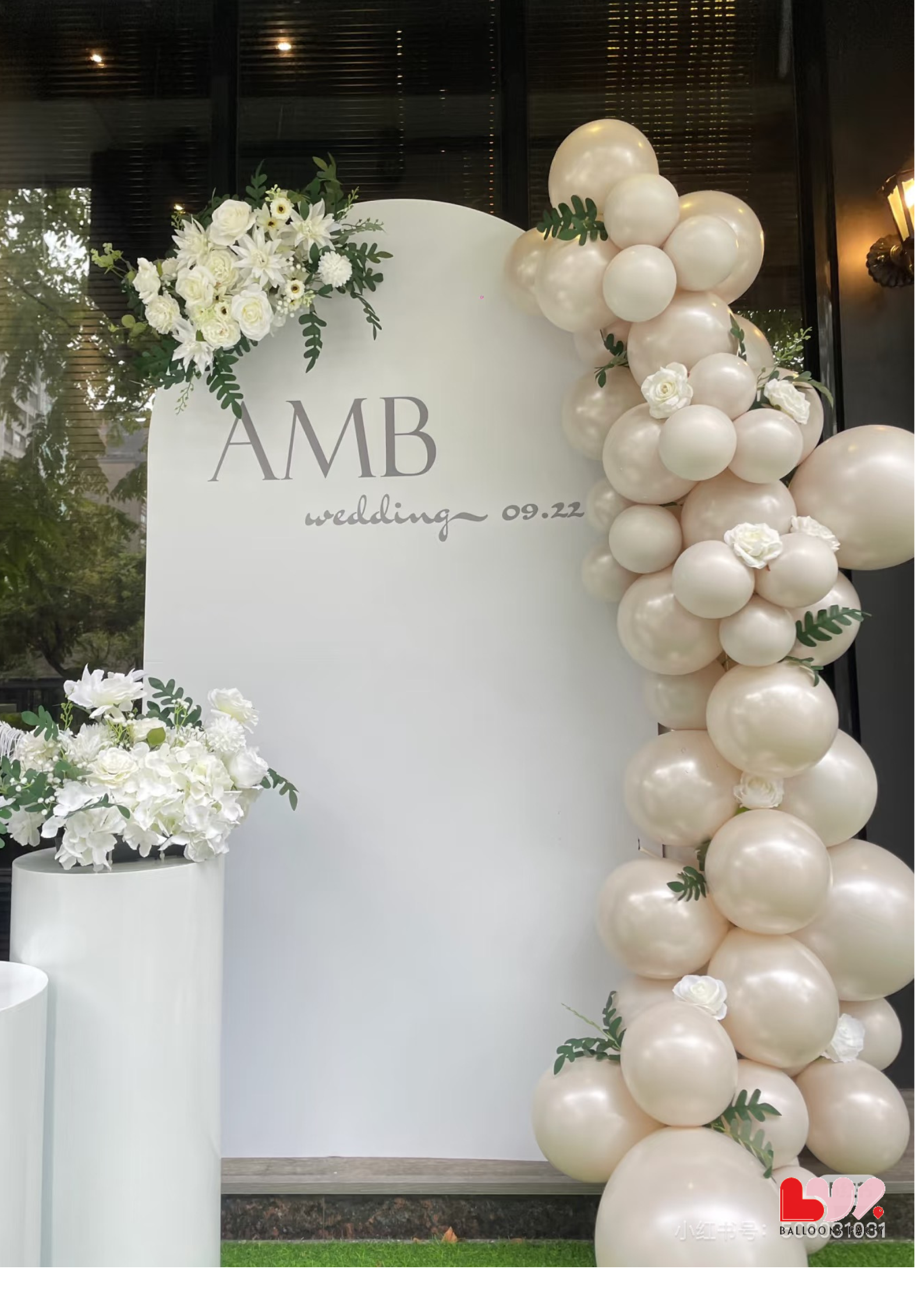 弧形背板搭配柔霧珍珠氣球,呈現低調卻極具質感的婚禮迎賓風格。
