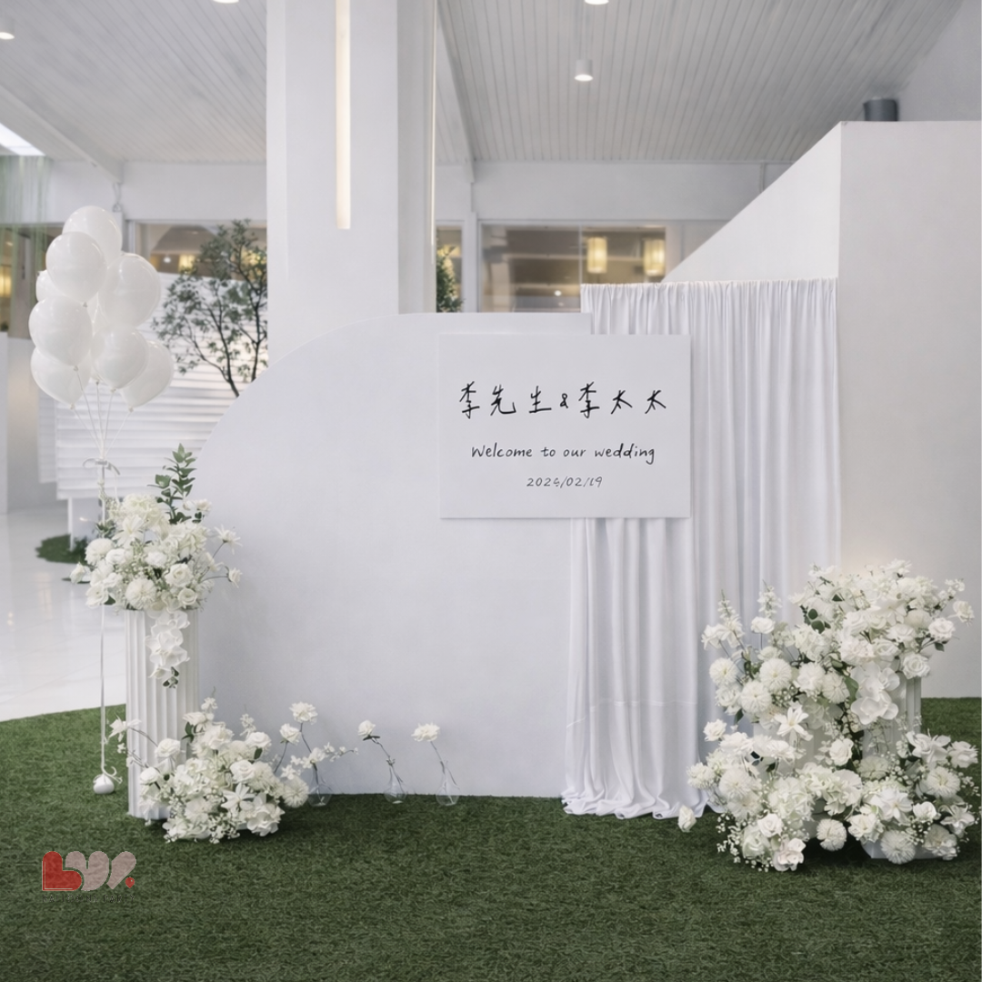 整體設計以霧白背板、柔軟布幔與白系花藝層層鋪陳,透過圓弧線條與留白比例,營造出安靜、純粹卻極具質感的迎賓畫面。