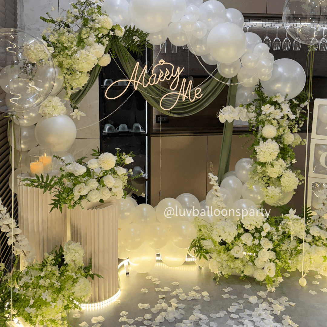 霓虹燈「Marry Me」在花叢間閃耀,