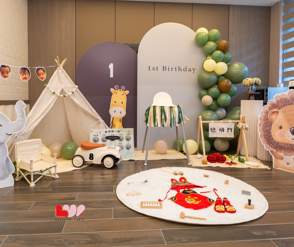 ・搭配氣球叢林、木質帳篷與可愛動物造型(大象、獅子、長頸鹿)