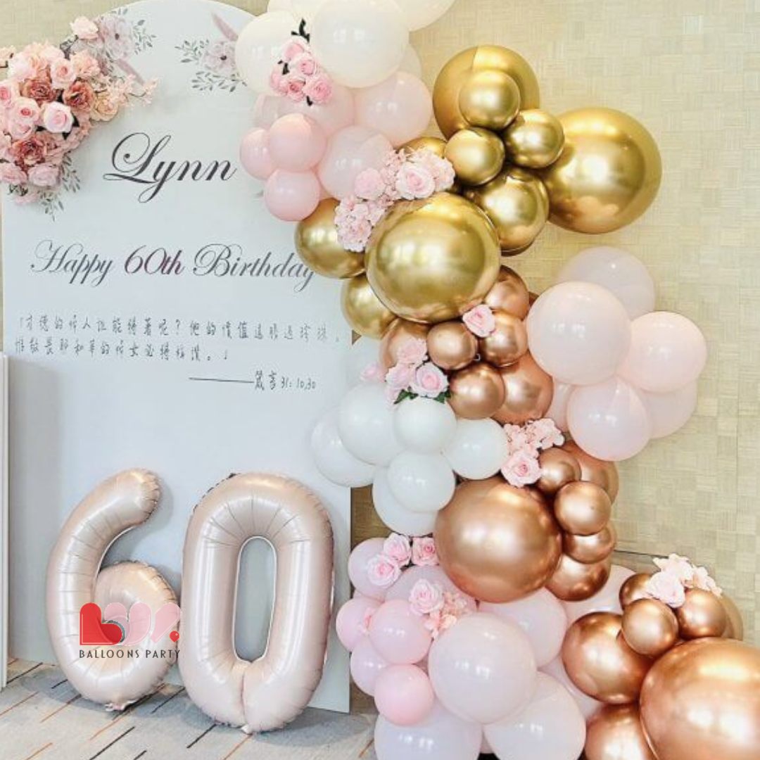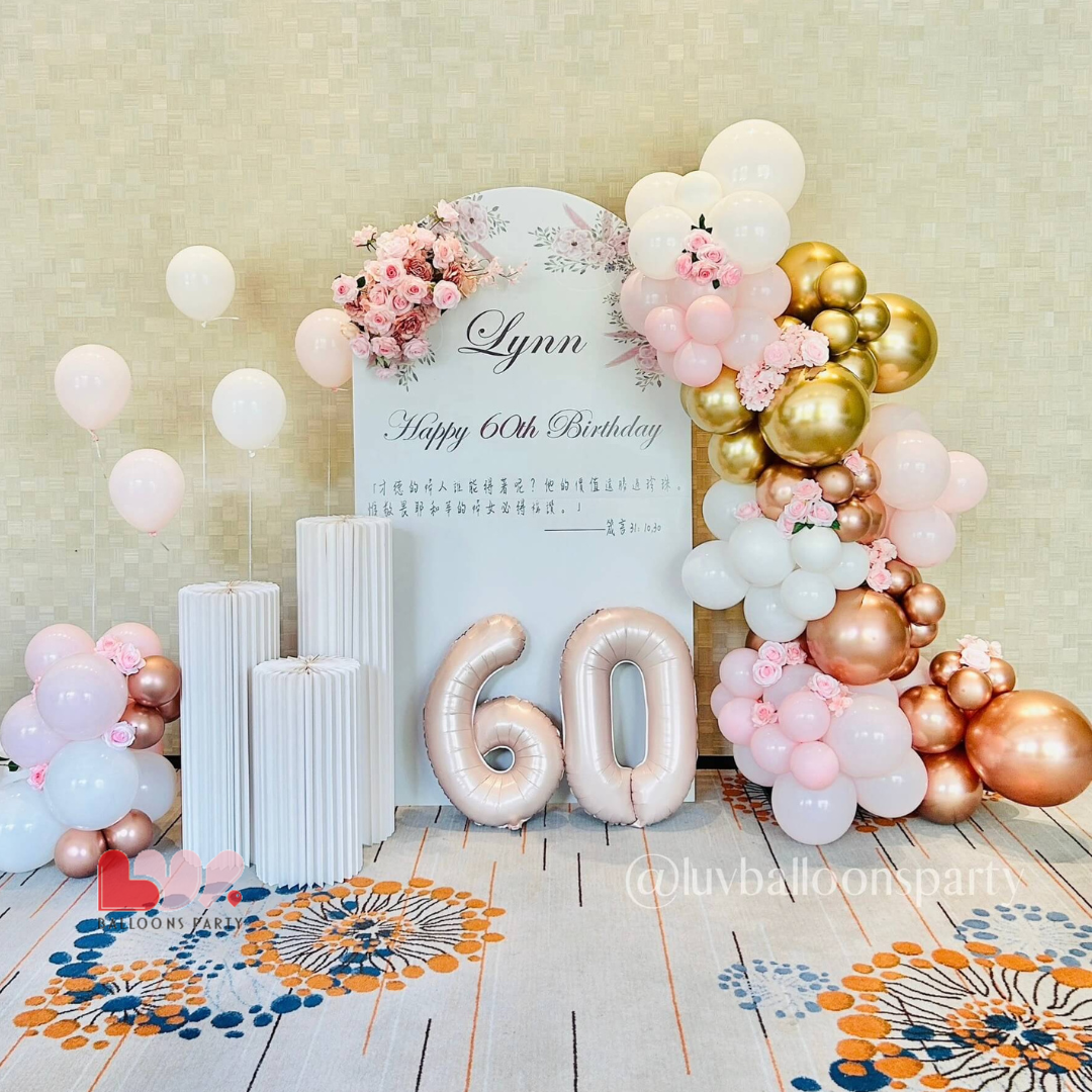 以馬卡龍粉與香檳金為主色,營造出浪漫、溫馨又帶有尊榮氣息的慶生氛圍。