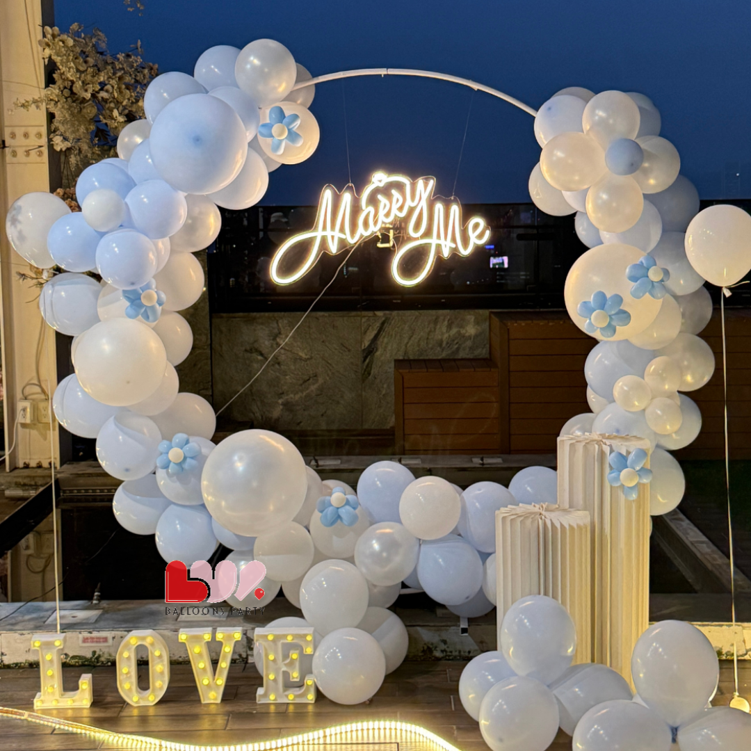 藍白氣球環繞成心形拱門,象徵愛的永恆,